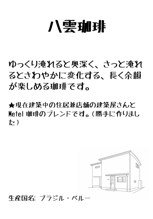 ★現在建築中の住居兼店舗の建築屋さんとMetel珈琲のブレンドです。(勝手に作りました)